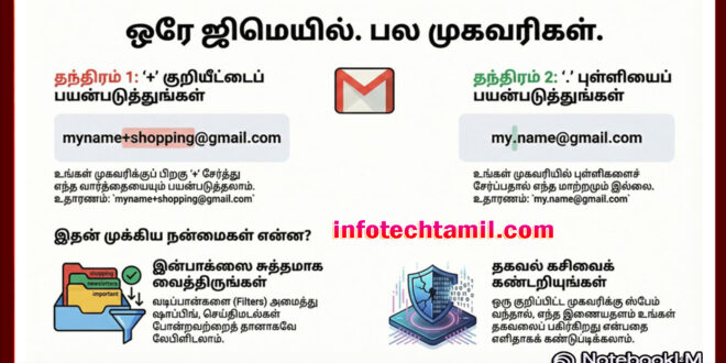 ஒரே ஒரு ஜிமெயில் கணக்கை வைத்துக்கொண்டு, எப்படிப் பல மின்னஞ்சல் முகவரிகளை உருவாக்குவது என்பதைப் பற்றி இங்கே கொடுக்கப்பட்டுள்ளது.