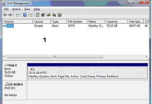 படத்தில் காடியிருப்பது 80 ஜீபீ கொள்ளளவுள்ள ஒரே பாட்டிசன் கொண்ட ஒரு ஹாட் டிஸ்க். ஏற்கனவே பாட்டிசன் செய்யப்பட்ட இந்த இந்த ஹாட் டிஸ்கை இரண்டு பாட்டிசன் கொண்டதாகப் பிரிக்க வெண்டுமானால் (படம் -2) அந்த பாட்டிசன் மீது மேல் ரைட் கிளிக் செய்து வரும் மெனுவில் Shrink Volume தெரிவு செய்ய வேண்டும். . அப்போது புதிதாக பாட்டிசனை உருவாக்க எவ்வளவு வெற்றிடம் உள்ளது என்பதை டிஸ்க் மெனெஜ்மண்ட் கருவி பரீட்சிக்க ஆரம்பிக்கும்.