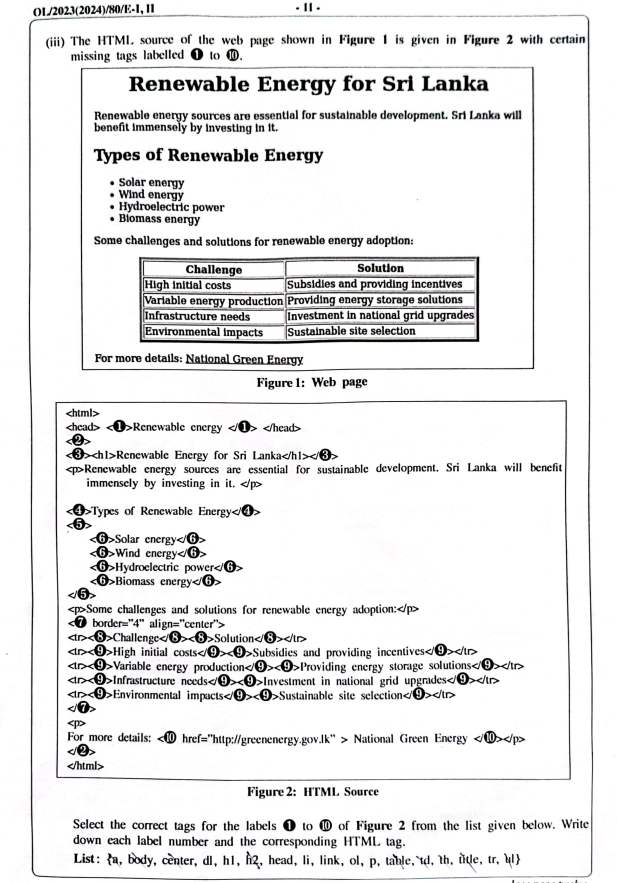 <html> <head> <❶>Renewable energy </❶> </head> <❷> <❸><h1>Renewable Energy for Sri Lanka</h1></❸> <p>Renewable energy sources are essential for sustainable development. Sri Lanka will benefit immensely by investing in it. </p>