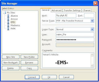 அடுத்து General டேபின் கீழ் Host எனுமிடத்தில் உங்கள் தளத்திறகான சேர்வர் முகவரியை டைப் செய்யுங்கள். உதாரணமாக ftp://ftp.example.com/. Server type எனுமிடத்தில் FTP தெரிவு செய்யுங்கள். . Port இல்க்கம் வழங்க வேண்டிய அவசியமில்லை