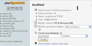 அடுத்து ஏற்கனவே டவுன்லோட் செய்த ஜூம்லா ஷிப் பைலை Joomlatest போல்டருக்கு நகர்த்தி விட்டு அதனை Extract செய்து விரித்து விடுங்கள்மறுபடியும் WAMP ஐக்கனில் க்ளிக் செய்து phpMyAdmin எனபதைத் தெரிவு செய்யுங்கள். அப்போது உங்கள் வெப் பிரவுசர் திறந்து கொண்டு ஜூம்லா தரவுத்தளத்தை நிர்வகிக்கும் பகுதிக்கு அழைத்துச் செல்லும். அங்கு Create new database எனுமிடத்தில் தரவுத்தளத்திற்குப் பொருத்தமான் ஒரு பெயரை வழங்கி (உதாரணம்:joomlatest) Create தெரிவு செய்து புதிதாக ஒரு தரவுத் த்ளத்தை உருவாக்குங்கள்.