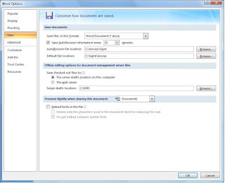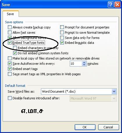 பைல் மெனுவில் Save As தெரிவு செய்ய வரும் சேவ் ஏஸ் டயலொக் பொக்ஸில் Tools க்ளிக் செய்து Save Options தெரிவு செய்யுங்கள். (Tools மெனுவில் Options தெரிவு செய்து Save டேபில் க்ளிக் செய்தும் இதே இடத்திற்கு வந்து சேரலாம்) அங்கு Embed true type font தெரிவு செய்து ஓகே சொல்லி விடுங்கள்,.எம்.எஸ்.வர்ட் 2007 மற்றும் எம்.எஸ்.வர்ட் 2010 பதிப்புகளில் Office பட்டனில் க்ளிக் செய்து Word Options தெரிவு செய்து Save க்ளிக் செய்யுங்கள். அப்போது தோன்றும் டயலொக் பொக்ஸில் Embed font in the file தெரிவு செய்து ஓகே செய்யுங்கள்.