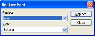 பவர்பொயிண்ட் ப்ரசண்டேசன் ஒன்றில் நீங்கள் பயன் படுத்திய எழுத்துரு உங்களுக்குப் பிடிக்க வில்லையானால் ஒவ்வொரு ஸ்லைடாகத் தெரிவு செய்து அதனை மாற்ற வேண்டிய அவசியமில்லை. ப்ரசண்டேசனில் உள்ள மொத்த ஸ்லைடுகளிலும் பொண்டை மாற்றுவதற்கு போமட் மெனுவுல் Replace Font தெரிவு செய்யுங்கள். அப்போது ஒரு சிறிய பெட்டி தோன்றும் Replace எனுமிடத்தில் தற்போது பயன் படுத்தியுள்ள எழுத்துருவின் பெயரைக் காட்டும். அதே போல் With எனுமிடத்தில் தேவையான பொன்டைத் தெரிவு செய்து ரிப்லேஸ் பட்டனில் க்ளிக் செய்ய ஒரே முறையில் எல்லா ஸ்லைடுகளிலும் பொண்ட் மாறி விடும்.