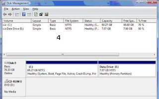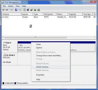 படத்தில் காடியிருப்பது 80 ஜீபீ கொள்ளளவுள்ள ஒரே பாட்டிசன் கொண்ட ஒரு ஹாட் டிஸ்க். ஏற்கனவே பாட்டிசன் செய்யப்பட்ட இந்த இந்த ஹாட் டிஸ்கை இரண்டு பாட்டிசன் கொண்டதாகப் பிரிக்க வெண்டுமானால் (படம் -2) அந்த பாட்டிசன் மீது மேல் ரைட் கிளிக் செய்து வரும் மெனுவில் Shrink Volume தெரிவு செய்ய வேண்டும். . அப்போது புதிதாக பாட்டிசனை உருவாக்க எவ்வளவு வெற்றிடம் உள்ளது என்பதை டிஸ்க் மெனெஜ்மண்ட் கருவி பரீட்சிக்க ஆரம்பிக்கும்.