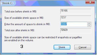 புதிதாக பாட்டிசன் ஒன்றை உருவாக்குவதற்குப் போதிய இடம் உள்ளதா எனப் பரீட்சித்த பின்னர் படம் (3) உள்ளது போல் Shrink டயலொக் பொக்ஸ் தோன்றும். அங்கு ஹாட் டிஸ்கை பாட்டிசன் செய்வதற்கு முன்னர் உள்ள பாட்டிசனின் மொத்த அளவு, அதனை சுருக்குவதன் மூல்ம் கிடைக்கப் பெறும் வெற்றிடம், புதிய பாட்டிசனை உருவாக்க நீங்கள் வழங்க விரும்பும் அளவு மற்றும் புதிதாக பாட்டிசனை உருவாக்கிய பின்னர் மாற்றமடையும் ஏற்கனவே இருந்த பாட்டிசனின் அளவு என்பவற்றை இந்த Shrink டயலொக் பொக்ஸில் பட்டியலிடும்.