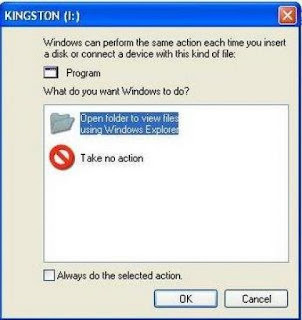 ஒரு பென் ட்ரைவை கணினியில் பொருத்தும் போதே தானாக திறந்து கொள்ளும் வகையில் விண்டோஸில் டிபோல்டாக செட்டிங் செய்யப்பட்டுள்ளது. வைரஸால் பாதிக்கப்பட்டுள்ள ஒரு பென் ட்ரைவை பொருத்தும் போது படத்திலுள்ளது போன்ற ஒரு சிறிய டயலொக் பொக்ஸ் தோன்றக் காணலாம். அந்த டயலொக் பொக்ஸில் ஓகே பட்டனில் க்ளிக் செய்து செய்து விடாமல் அதனை கேன்சல் செய்து மூடி விடுங்கள்.