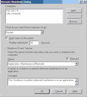 முதலில் கணினி அட்மினிஸ்ட்ரேட்டராக லொக் இன் செய்து கொள்ள வேண்டும். பின்னர் ஸ்டார்ட் பட்டனில் க்ளிக் செய்து ரன் தெரிவு செய்யுங்கள். அங்கு தோன்றும் ரன் பொக்ஸில் shutdown –I என டைப் செய்து ஓகே க்ளிக் செய்ய Remote Shutdown Dialogbox தோன்றும். அங்கு Add பட்டனில் க்ளிக் செய்து நீங்கள் சட்டவுன் செய்யவிருக்கும் கணினியின் பெயரை அல்லது ஐபி முகவரியை டைப் செய்து சேர்த்து விடுங்கள். ஒரே நேரத்தில் ஒன்றுக்கு மேற்பட்ட கணினிகளையும் இவ்வாறு சேர்க்கலாம். அடுத்து “What do you want these computers to do எனுமிடத்தில் விரும்பும் செயற்பாட்டையும் (log off, restart, shutdown) தெரிவு செய்து விடுங்கள். இந்த செயற்பாடு பற்றி அந்தக் கணினியில் பணியாற்றிக் கொண்டிருக்கும் பயனருக்கு அறிவிப்பதற்கு “Warn users of the action” என்பதைத் தெரிவு செய்து ஒரு நேர இடை வெளியையும் குறிப்பிடலாம். அடுத்து ஓகே பட்டனில் க்ளிக் செய்ய அந்தக் கணினி நீங்கள் தெரிவு செய்த செயற்பாட்டை நிறைவேற்றும்.