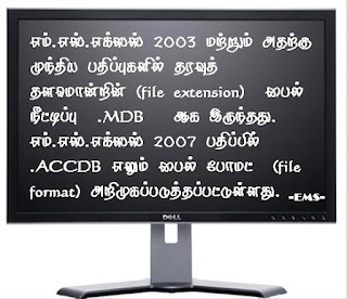 எம்.எஸ்.எக்ஸஸ் 2003 மற்றும் அதற்கு முந்திய பதிப்புகளில் தரவுத் தளமொன்றின் (file extension) பைல் நீட்டிப்பு .MDB ஆக இருந்தது. எம்.எஸ்.எக்ஸஸ் 2007 பதிப்பில் .ACCDB எனும் பைல் போமட் (file format) அறிமுகப்படுத்தப்பட்டுள்ளது.