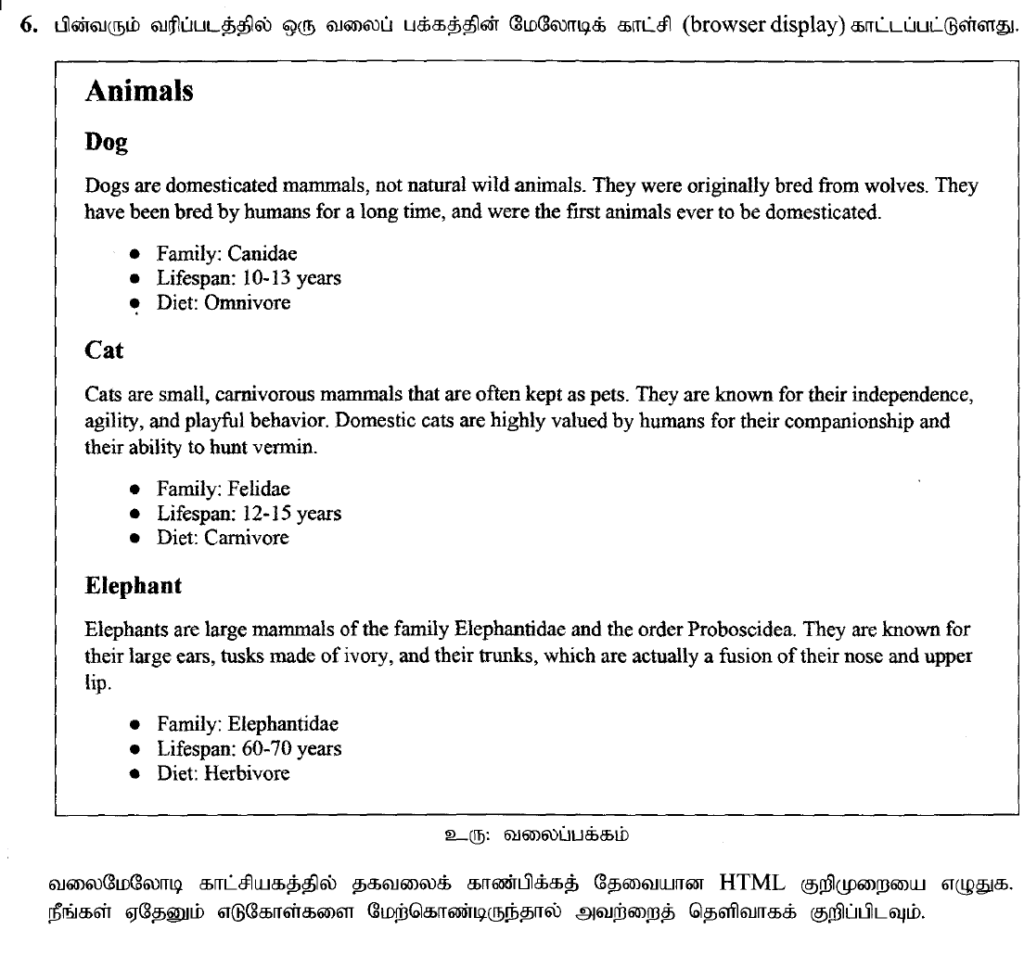 Assumption: Use <h1> for the main title, <h2> for animal names, <p> for descriptions, and <ul> for the bulleted lists.