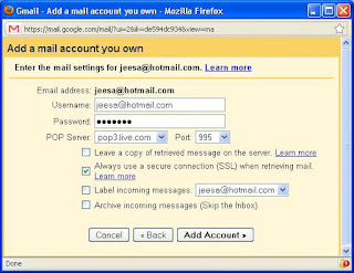 அதற்குப் பின்வரும் வழி முறையைக் கையாளுங்கள். முதலில் உங்கள் ஜிமெயில் கண்க்கிற்குள் லொகின் செய்து நுளையுங்கள்.. அங்கு Settings க்ளிக் செய்யுங்கள். தோன்றும் விண்டோவில் Accounts டேபில் க்ளிக் செய்து Get mail from other accounts என்பத்ன் கீழுள்ள Add another email account என்பதைக் க்ளிக் செய்யுங்கள். அப்போது ஒரு பொப் அப் விண்டோ தோன்றும்அங்கு பிற மின்னஞ்சல் கணக்கிற்குரிய முகவரியை வழங்கி அடுத்த கட்டம் செல்லுங்கள். அப்போது அதற்குரிய பாஸ்வர்டை வழங்குமாறு கேட்கும். அதனை வழங்கி கீழுள்ள Add Account பட்டனில் க்ளிக் செய்து விடுங்கள்.