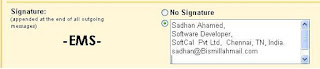ஜிமெயிலில் இயல்பு நிலையில் (default) இந்த கையொப்பம் இடும் வசதி செயற்படாது. அதனைச் செயற்பட வைப்பதற்கு முதலில் உங்கள் ஜிமெயில் கணக்கிற்குள் நுளையுங்க்ள். அங்கு Settings க்ளிக் செய்து தோன்றும் விண்டோவில் General டேபின் கீழ் Signature என்பதற்கு எதிரேயுள்ள பெட்டியில் நீங்கள் விரும்பிய விவரங்களை கையொப்பமாக் டைப் செய்து விட்டு அதன் கீழுள்ள Save Changes பட்டனில் க்ளிக் செய்யுங்கள்.