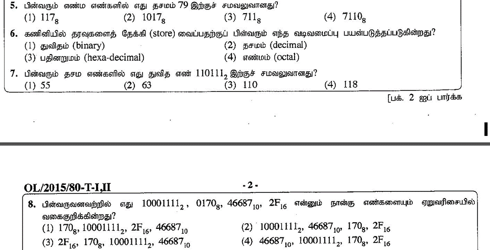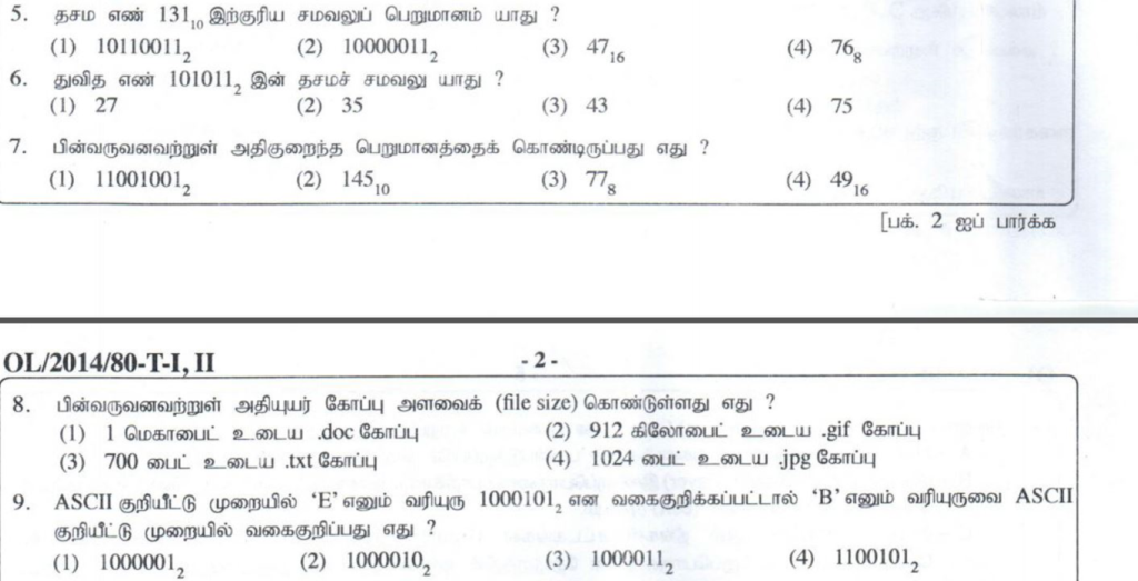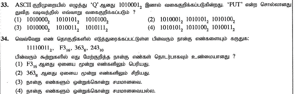 33. ASCII குறிமுறையில் எழுத்து ‘Q’ ஆனது 1010001, இனால் வகைகுறிக்கப்படுகின்றது. ‘PUT’ என்ற சொல்லானது துவித வடிவத்தில் எவ்வாறு வகை குறிக்கப்படும் ?