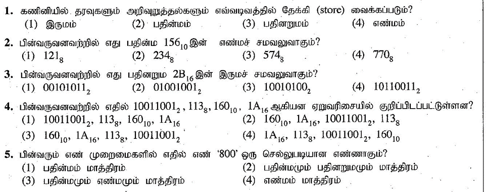 1. கணினியில் தரவுகளும் அறிவுறுத்தல்களும் எவ்வடிவத்தில் தேக்கி (store) வைக்கப்படும்?