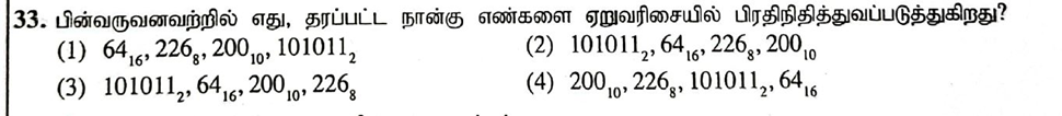 33. பின்வருவனவற்றில் எது, தரப்பட்ட நான்கு எண்களை ஏறுவரிசையில் பிரதிநிதித்துவப்படுத்துகிறது?