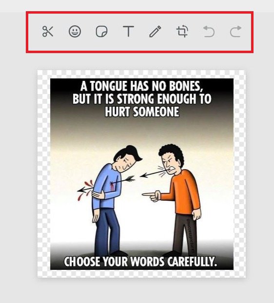 அப்போது அந்தப் படத்தின் மேல் அதனை எடிட் செய்வதற்கான கருவிகள் தோன்றும். அங்கிருந்து, அப்படத்தில் இமோஜி, உரை மற்றும் பிற ஸ்டிக்கர்களை நுழைக்க முடியும். படத்தின் அளவையும் கூட மாற்ற முடியும்.