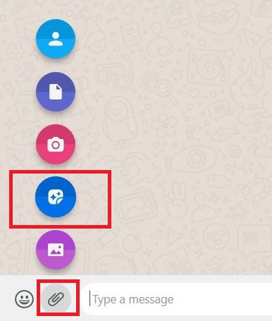 இந்த அம்சத்தைப் பயன்படுத்த, கணினி பிரவுசரில் WhatsApp web க்குச் சென்று, காகித கிளிப் (paper clip) ஐகானைக் கிளிக் செய்யுங்கள்.